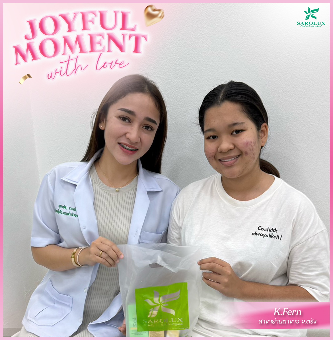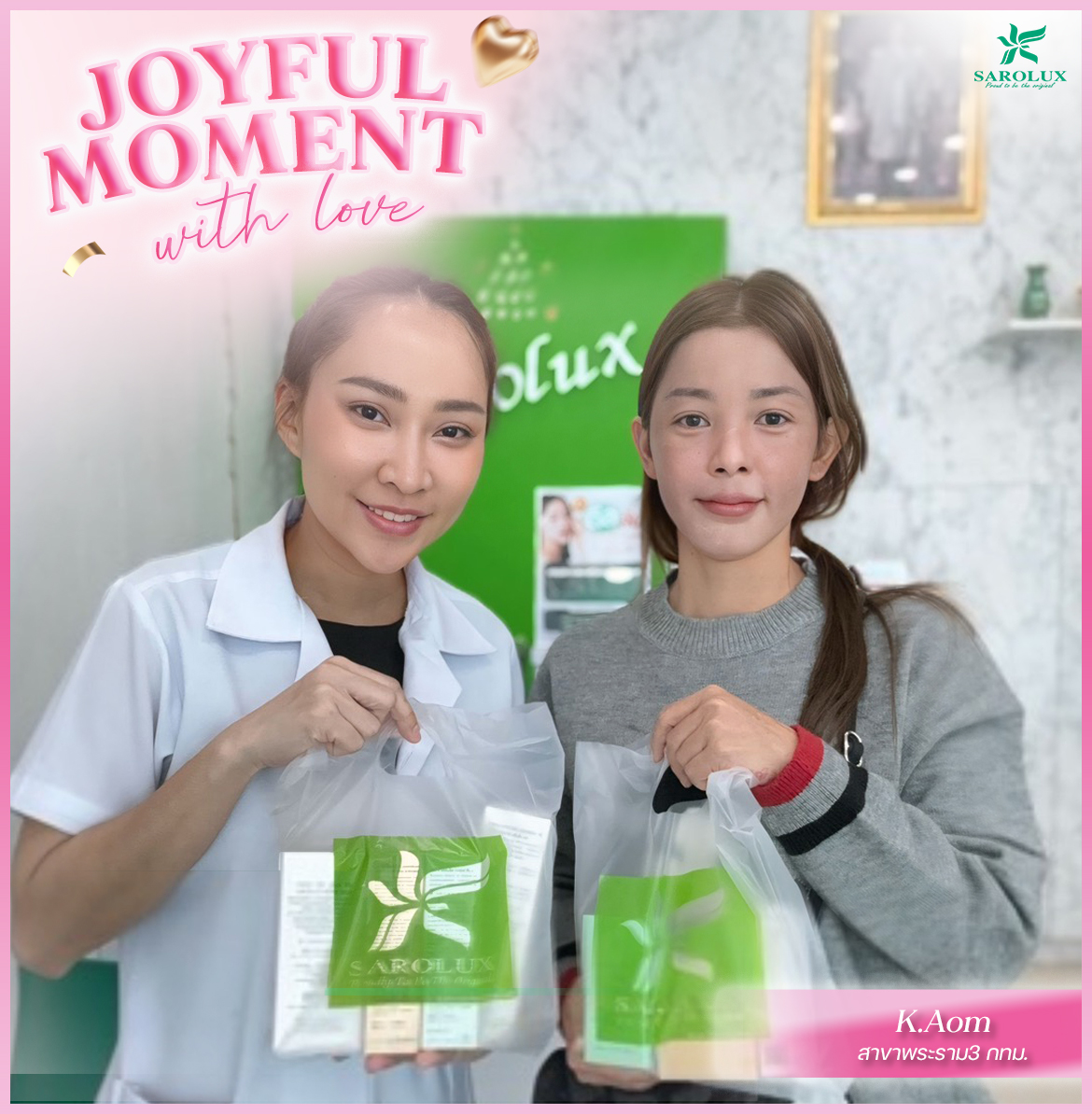 Sarolux Joyful Moment ในเดือนแห่งความรักนี้ เราอยากส่งต่อการดูแลที่ดีที่สุดให้คุณลูกค้า ทุกความไว้วางใจ ทุกการดูแลผิว คือความผูกพันที่สะโรรักษ์ใส่ใจเสมอ